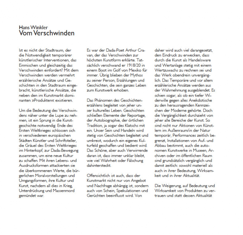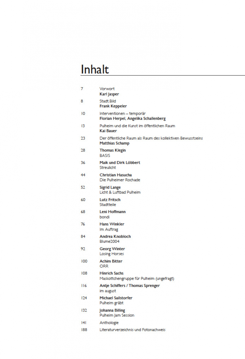 Texte: u.a. Kai Bauer, Konrad Bitterli, Andreas Denk, Jochen Heufelder, Kay von Keitz, Gerhard Kolberg, Sabine Elsa Müller, Brita Polzer, Jürgen Raap, Annett Reckert, Mathhias Schamp, Jan Verwoert