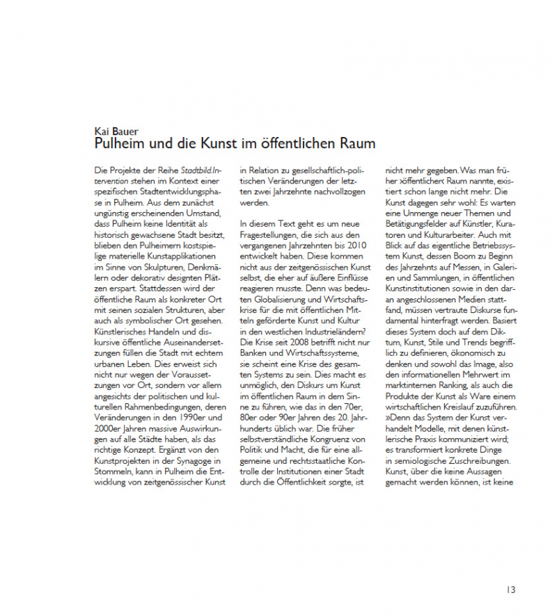 Seit 1998 lädt die Stadt Pulheim jedes Jahr eine Künstlerin oder einen Künstler zu einer temporären Arbeit im öffentlichen Raum ein. Inzwischen wurden vierzehn Projekte realisiert, von denen dieses Buch in kompakter, anregender Form erzählt. Etwa »Pulheim gräbt«, eine Schatzsuche, die Michael Sailstorfer 2009 unter großem Medieninteresse inszenierte.* Oder Christian Hasuchas „Pulheimer Rochade“, für die 25m² Pulheim gegen 25m² Brauweiler ausgetauscht wurden.